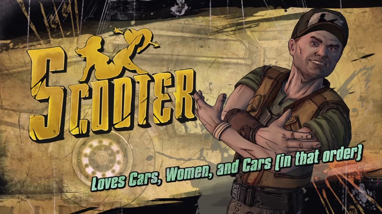 In Tales from the Borderlands, Scooter makes another return in episodes Atlas Mugged and Escape Plan Bravo. In the former, Fiona and Sasha show up to his new garage where he works alongside Janey Springs. Scooter recognizes them as the winners of the latest Bandit Race and agrees to repair their vehicle for a hefty sum of cash. When they are unable to pay it, he suffices with a compromise by asking them to sponsor him, which, provided they keep racing, would net him some extra attention. Fiona and Sasha lie to him and he agrees to repair their ride. Alternatively, if Fiona disagrees to keep racing, this will force Sasha to flirt with Scooter which convinces him to repair their vehicle. She is seriously disgusted with herself for doing that.