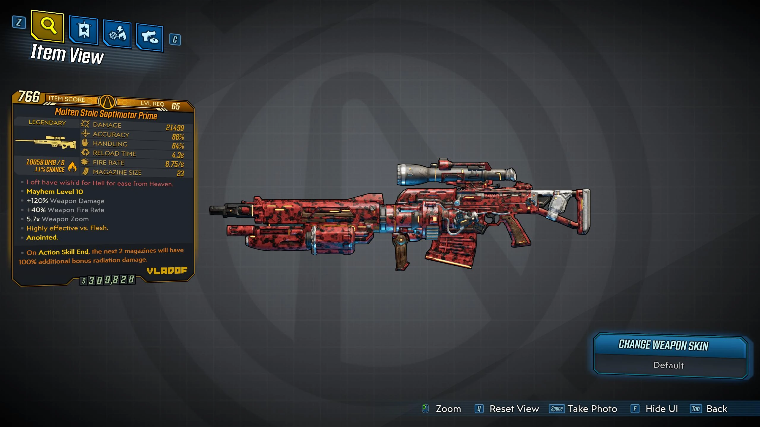 Septimator Prime is a legendary sniper rifle exclusive to the Psycho Krieg and the Fantastic Fustercluck DLC for Borderlands 3 and is manufactured by Vladof.