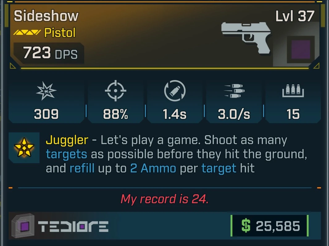 - Juggler – Let's play a game. Shoot as many targets as possible before they hit the ground, and refill up to 2 Ammo per target hit.