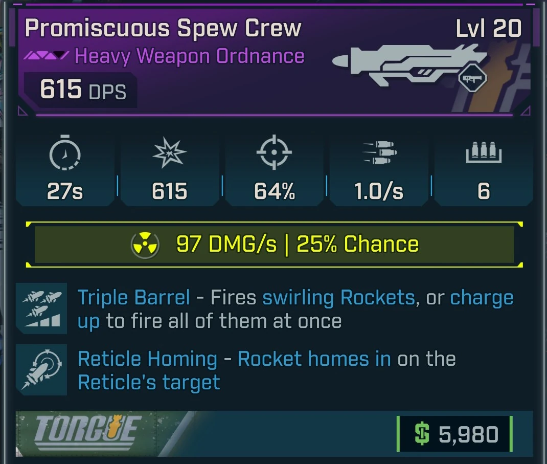 Spew Crew is common heavy weapon ordnance in Borderlands 4 manufactured by Torgue. It is obtained randomly from any suitable loot source.
