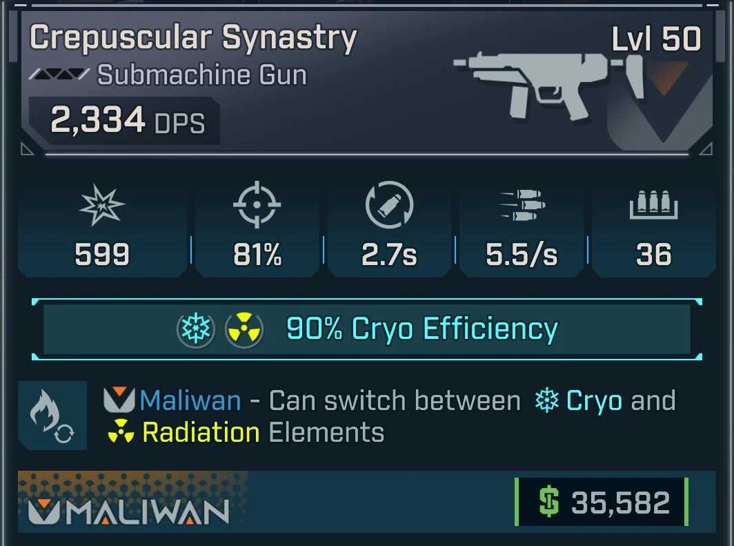 Synastry is a common submachine gun in Borderlands 4 manufactured by Maliwan. It is obtained randomly from any suitable loot source.