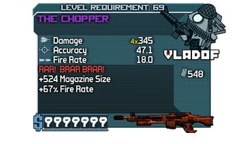 The Chopper is a unique machine gun exclusive to the The Secret Armory of General Knoxx DLC for Borderlands and is manufactured by Vladof.