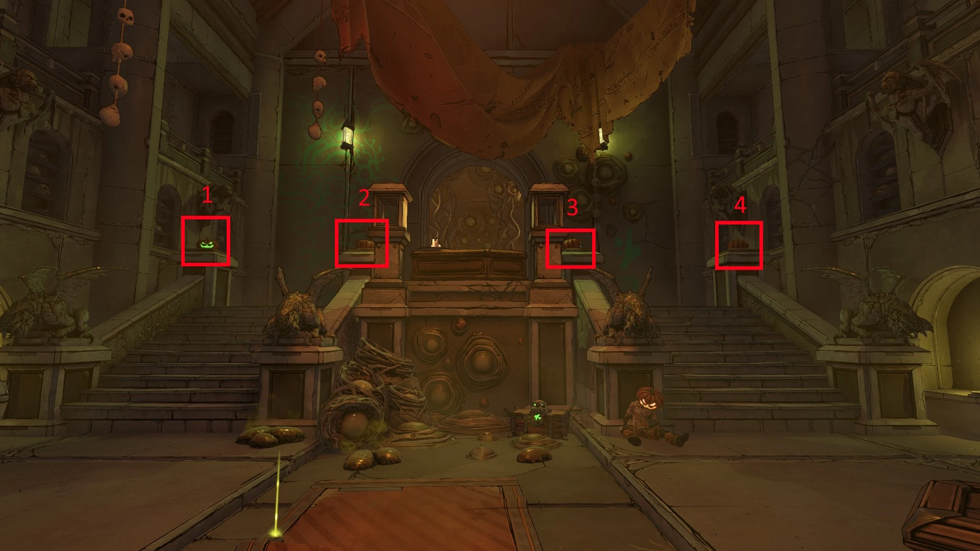 The combination changes every time the player enters the instance. If the combination is input incorrectly, an evil laugh is triggered and the Ossuary is blocked for that run. If it is input correctly, a bell rings and the wall across from the chains opens up to allow access. Note that the pumpkins are destructible objects, so careful aiming with weapons that do as little splash as possible is strongly recommended.