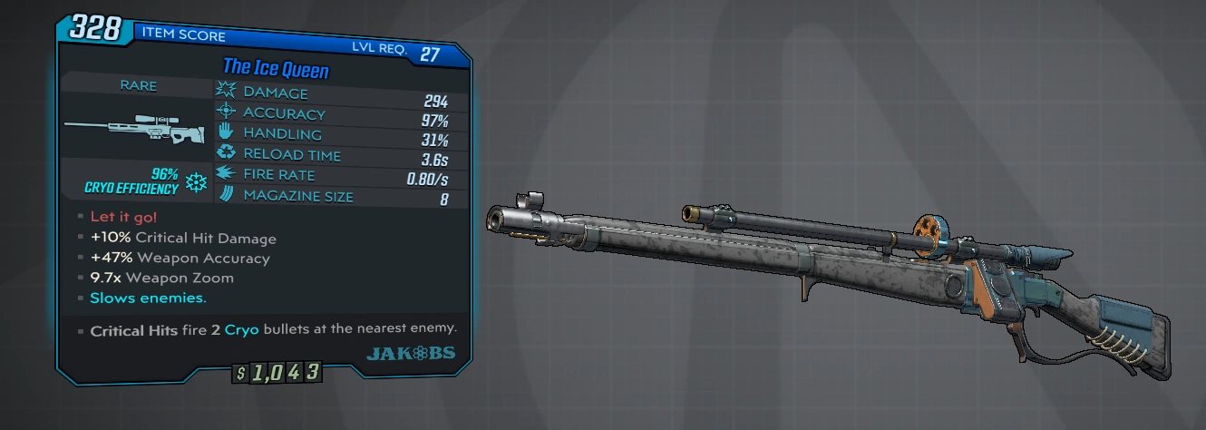 +10% critical damage +47% accuracy 9.7x weapon zoom Slows enemies Critical Hits fire 2 Cryo bullets at the nearest enemy. |