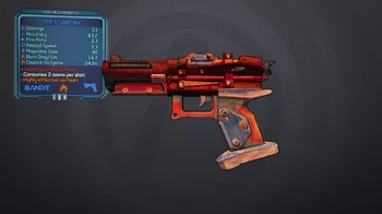 The Tinderbox is the first unique weapon characters will typically encounter in their playthrough. It acts as an introduction to incendiary damage (if no other fire weapons have been obtained already) and is effective at damaging or igniting flesh targets. However, the fixed element, low projectile speed, and low ammo efficiency makes it unsuitable for general combat. The Tinderbox will usually find use during The Road to Sanctuary, where bullymongs and low-level bandits are aplenty, but will quickly be replaced soon after with more reliable weapons.