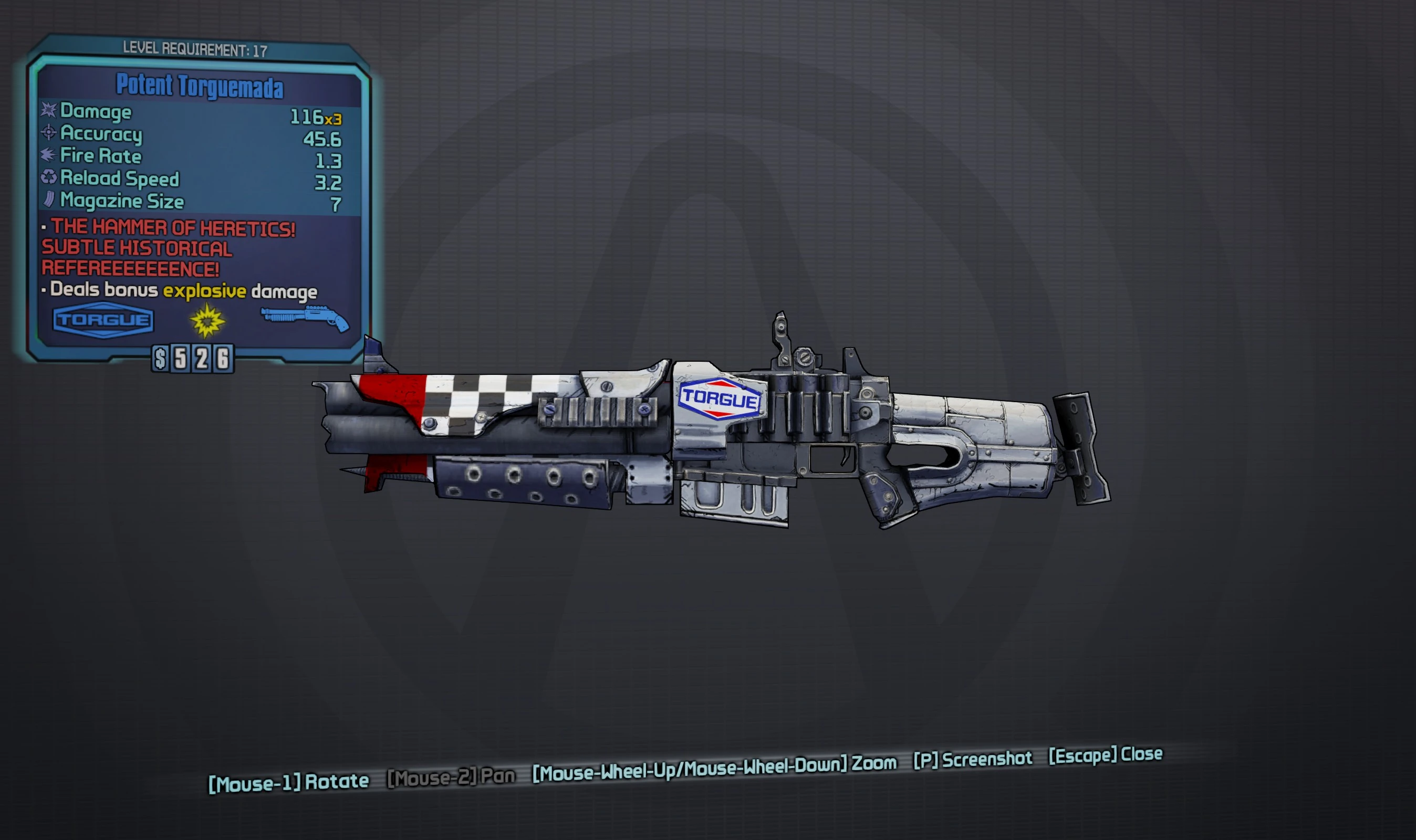 Torguemada is a unique shotgun manufactured by Torgue. It is obtained from the mission Torgue-o! Torgue-o! located in Serenity's Waste, by destroying the light reactor.