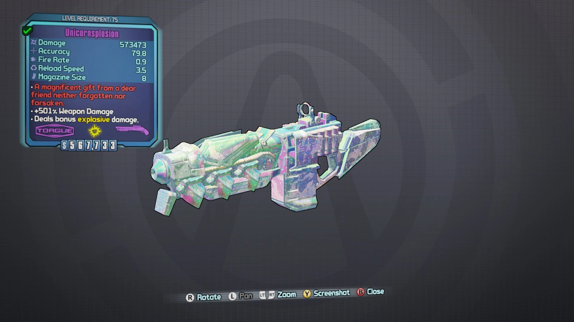 Unicornsplosion is an effervescent E-tech shotgun manufactured by Torgue. It can be obtained by feeding Butt Stallion in The Backburner while wearing the Mysterious Amulet.