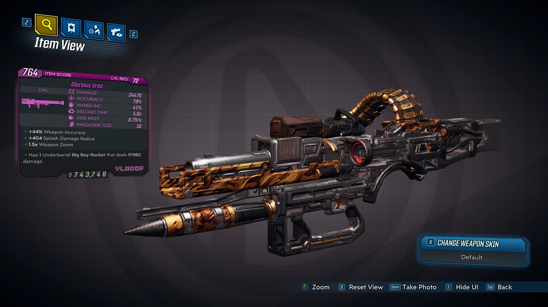 Featuring a single short barrel, Vred has highest damage and lowest fire rate among Vladof rocket launcher variants. Vred has base splash radius of 195.