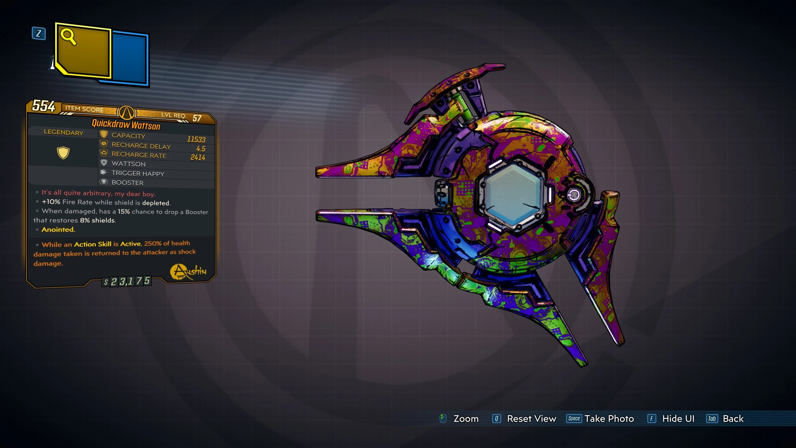Wattson is a legendary shield in Borderlands 3 manufactured by Anshin. It is exclusive to Revenge of the Cartels and is only obtainable from Fish Slap, Tyrone Smallums, and Joey Ultraviolet.