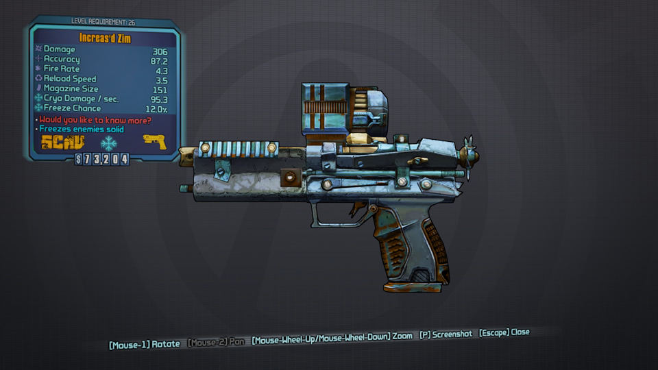 Zim is a legendary pistol in Borderlands: The Pre-Sequel manufactured by scavs. Zim is obtained randomly from any suitable loot source, but has an increased chance to drop from Giant Shuggurath of Ice located in Triton Flats.